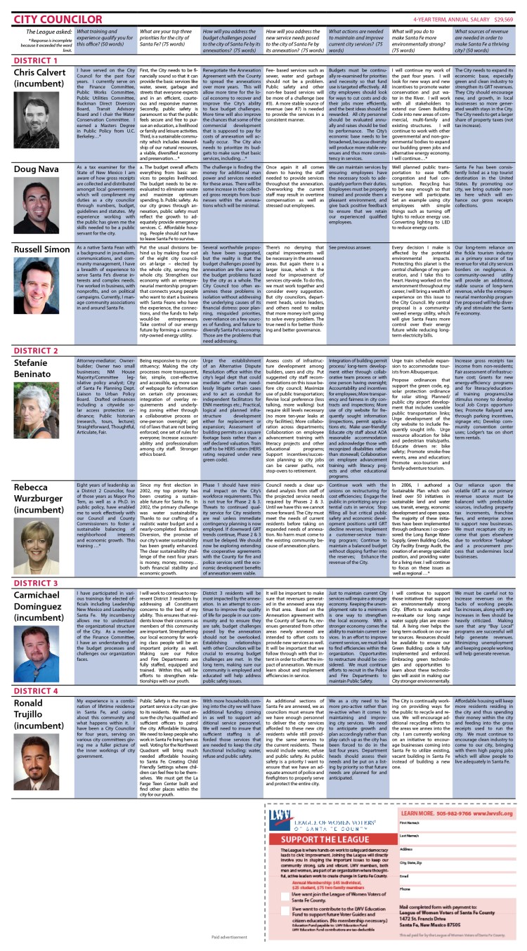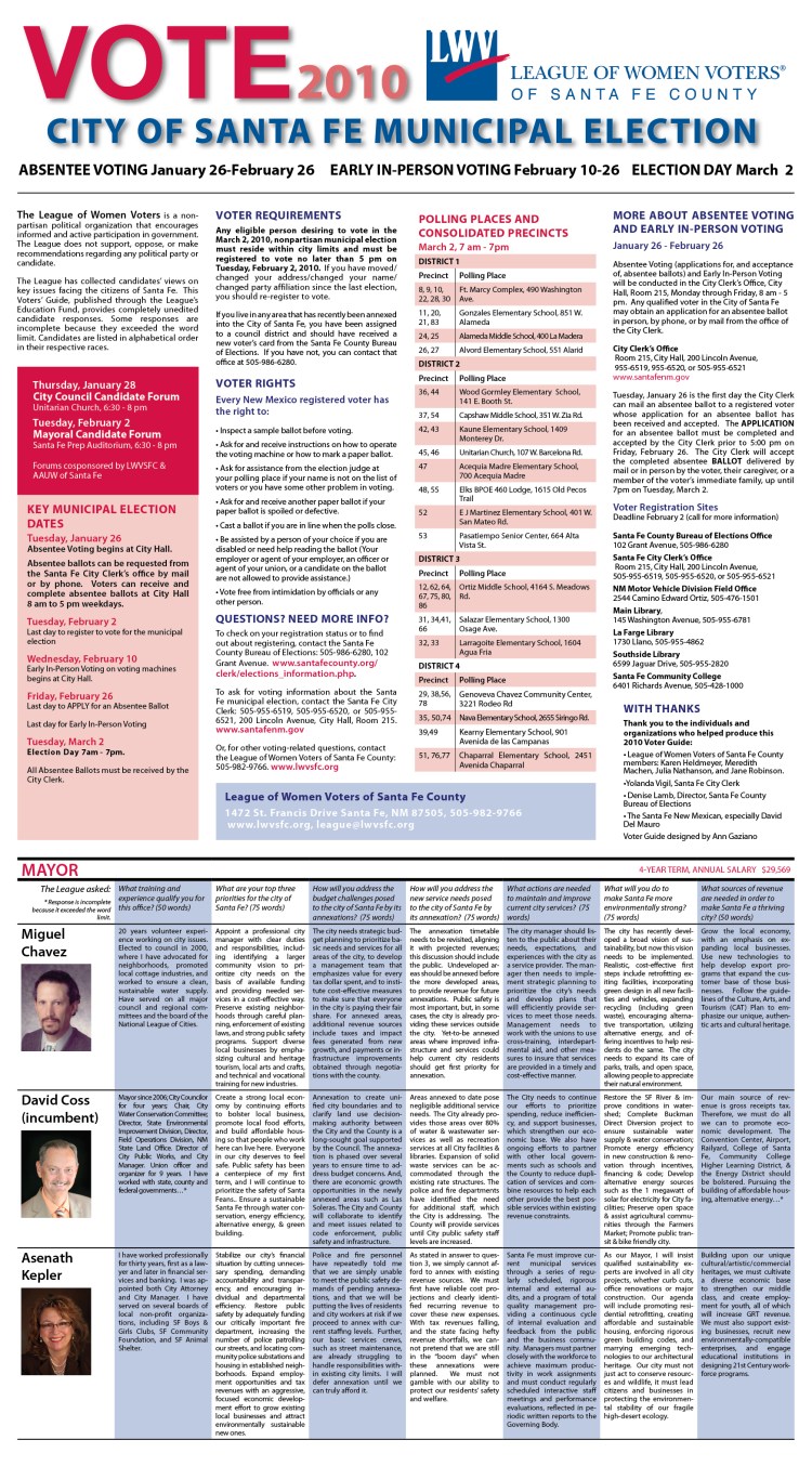 Voter’s Guide, Winter 2010 / Client: League of Women Voters of Santa Fe County / Description: This Guide was produce for the local municipal elections and printed and distributed by the Santa Fe New Mexican newspaper. / Skills: InDesign, Illustrator and Photoshop.
