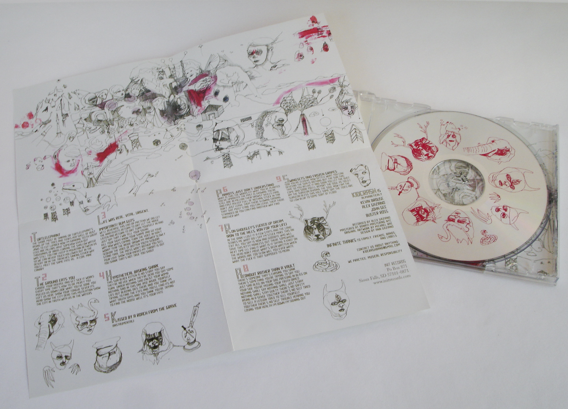 Client: Kidcrash / Description: Vinyl gatefold album, CD, and Tape design and layout. Drawings by Mike Rae. / Skills: InDesign and Photoshop