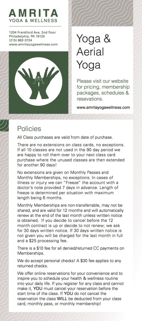 Client: Amrita Yoga & Wellness Studio / Description: As a long standing client a variety of print projects were created, using original and existing design elements, to produce service advertisements, offering menus, event posters, flyers, postcards, and calendars. Skills / Photoshop, Illustrator, InDesign, Digital Photography, Pre-press and printer relations.
